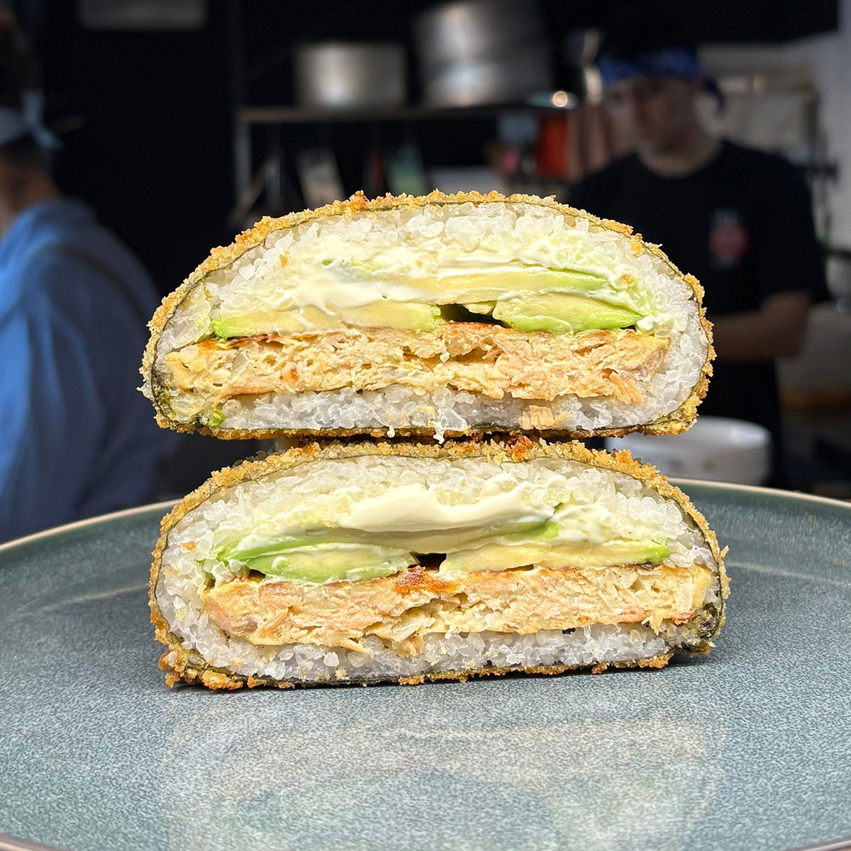 Hamburguesa 100% salmon a la plancha, queso phila y palta.