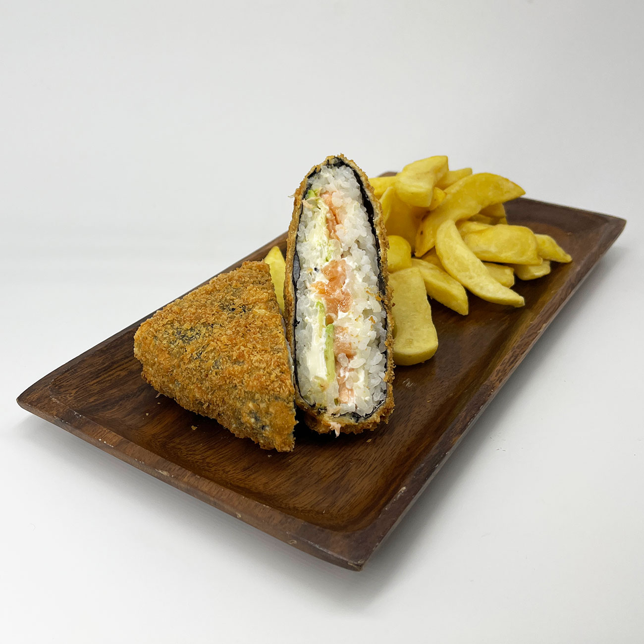 Base de hot roll con arroz, salmón fresco, queso philadelphia y palta.